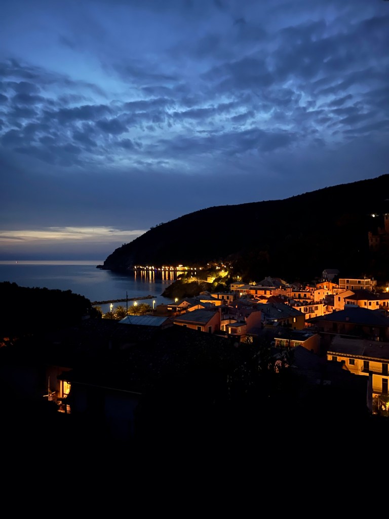 West and north of Tuscany. This area is the Italian Rivera and our new home, Moneglia, is famous for its beaches.It’s on the Mediterranean Sea and as you can see the climate is very different than Piedmont.Main Street, very quiet here as it’s too cool for the beach ( 75*)View from our patio at night. Tour guide Cindy says, ok train trip and walking tour of Cinque Terre tomorrow. Get your new knee ready. Lots of hills , stairs and cobblestones.First up, Riomaggiore