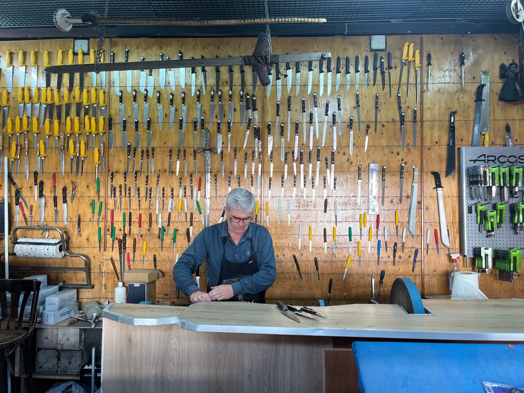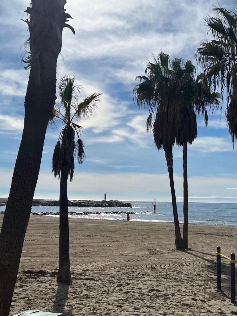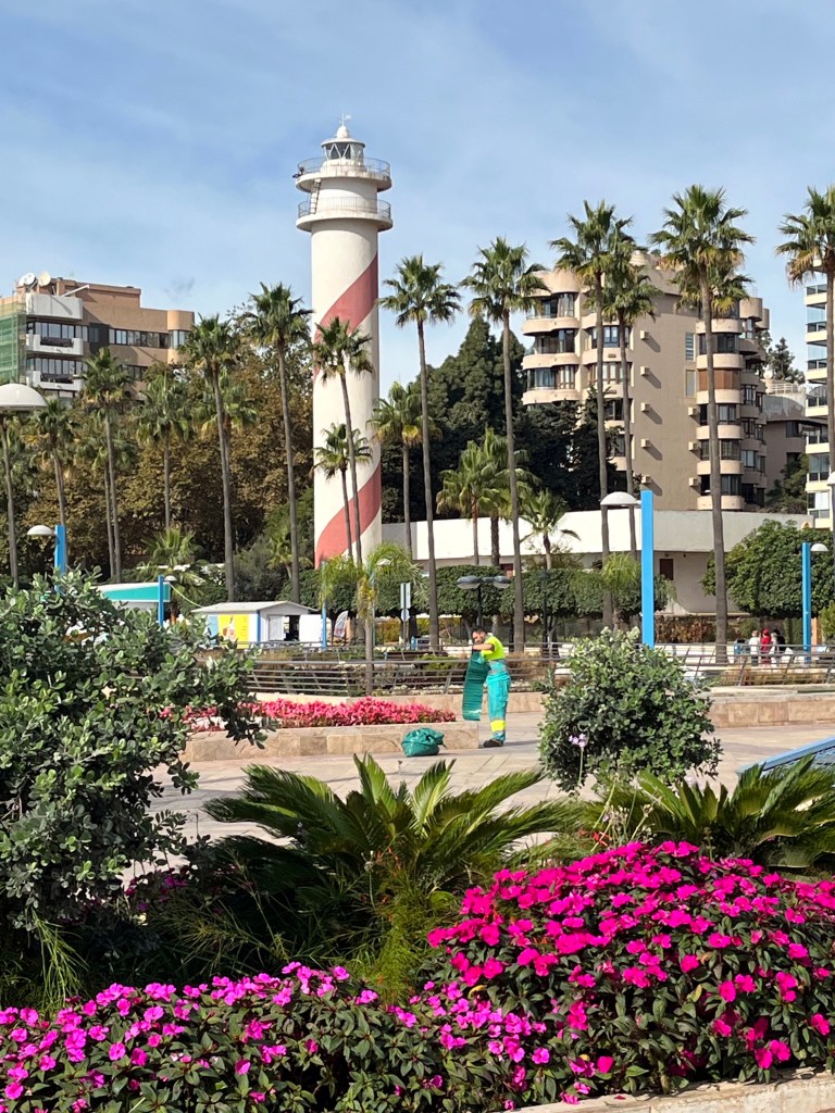 Marbella is famous for potted plants lining the streets in old town.Walking tour says tour guide Cindy. It’s all downhill from the bus station, but that means it’s all uphill going back🥵Lots and lots of condos , lots and lots of Brits.Short Promenade Beautiful modern square Lighthouse for tourists We stopped by the Central Mercado, not much happening it’s Monday. I did like this guy sharpening and selling knives Fun walking tour. I wasn’t too big a fan of Marbella, it’s a little touristy and crowded for our taste.The whole drive down the Costa del Sol is packed with condos and golf courses. Think Florida, Arizona and Mexico combined😜Ok, back home to Malaga and a cocktail on our balcony watching the sunset.