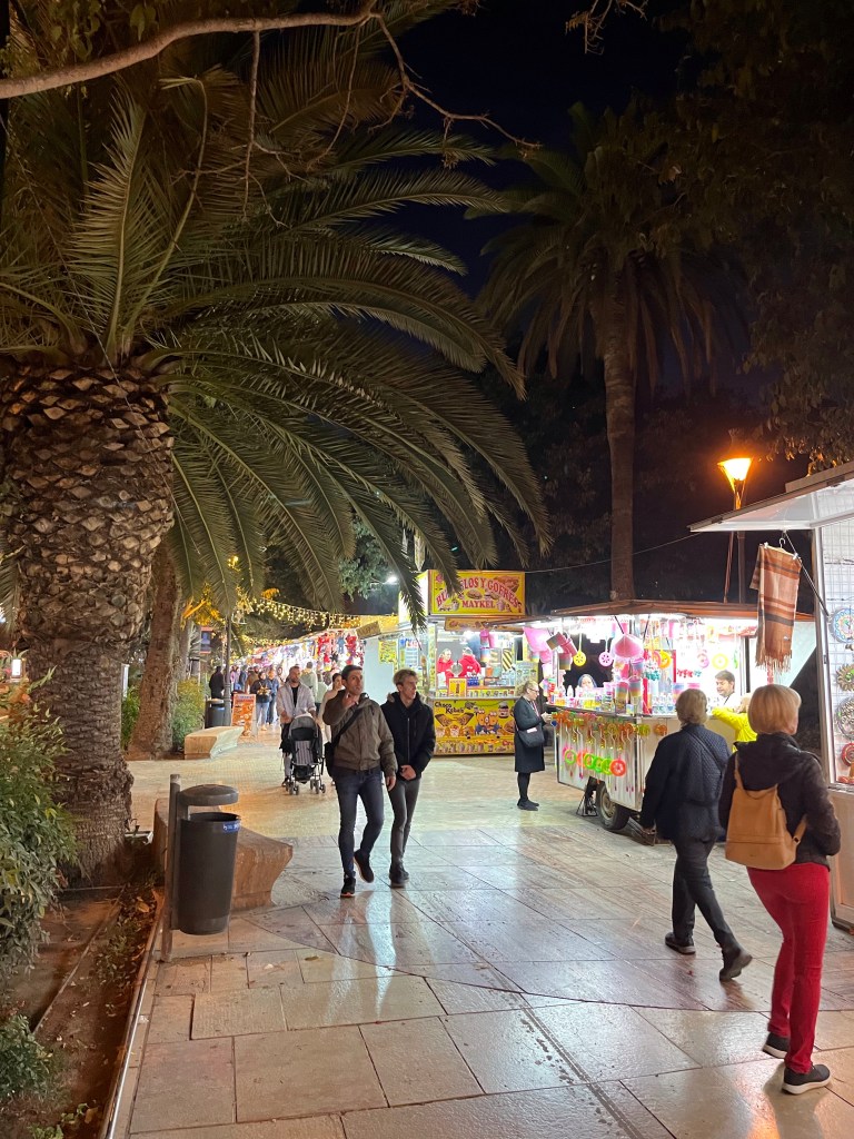 Christmas booths are setup and people are everywhere shopping, eating, drinking. Notice the coats, 59 degrees at night. Better break out the wool coats.