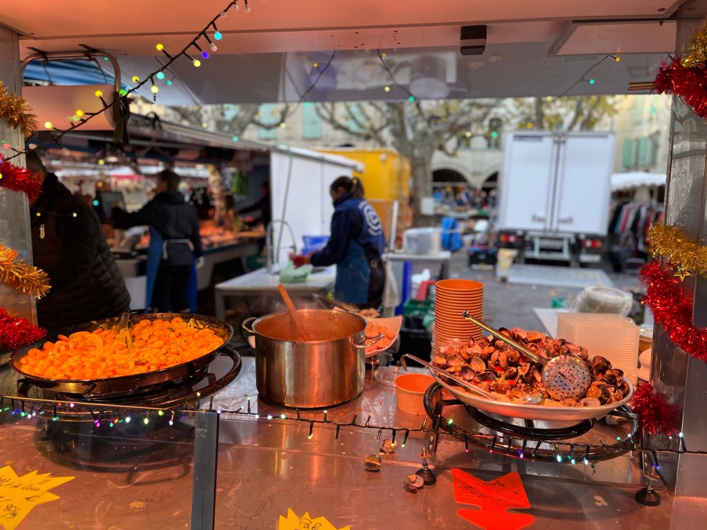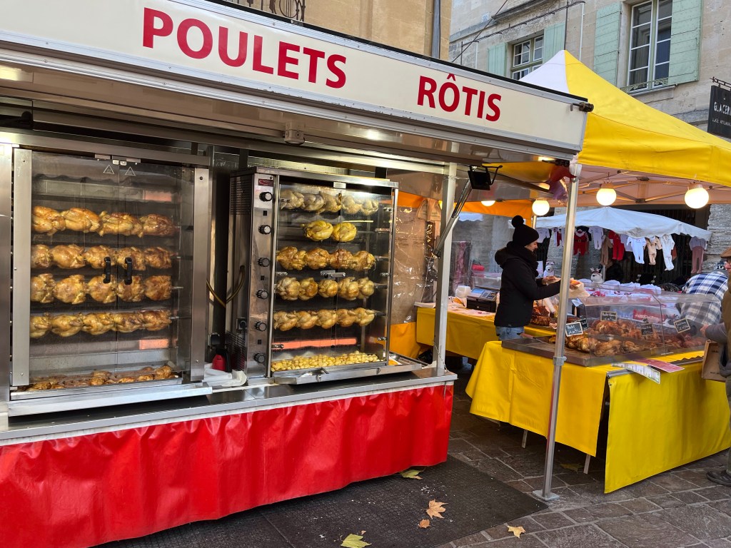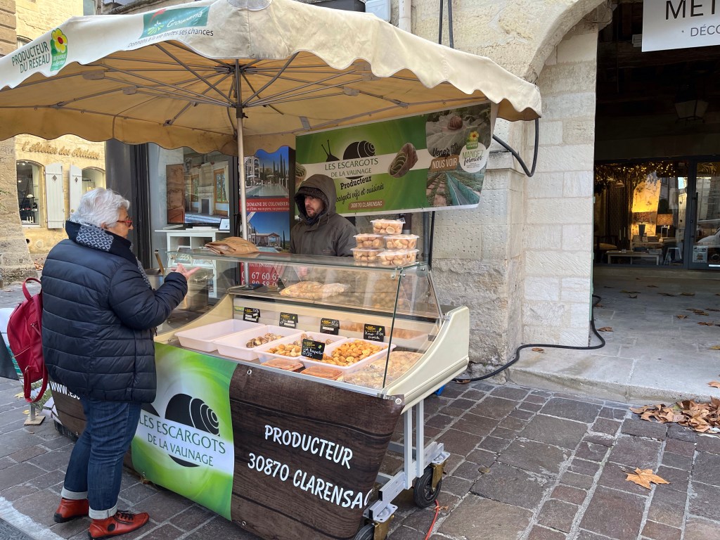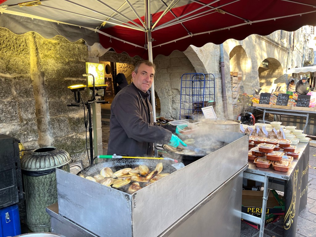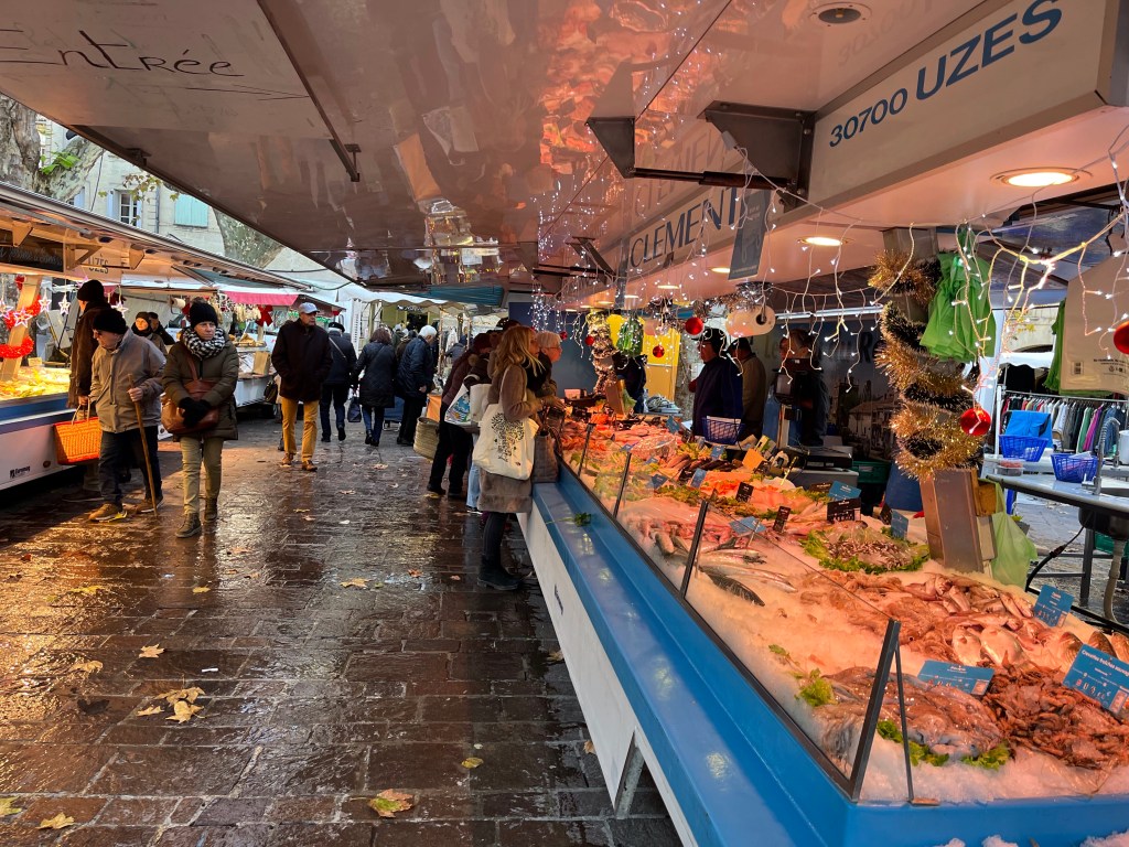 Greetings from beautiful and cold Uzes, France Uzes is famous for its Saturday market. It’s open year round and everything in the world is sold on the streets, squares and alleys of beautiful Uzes. Let’s take a walk through the city.The vendors setup every Saturday in a matter of an hour or so, and then take it all down every Saturday afternoon. Amazing!Fresh, beautiful produce in December! You know we’re buying our weekly needs.This guy is frying Eggplants and selling them so you can make eggplant parmigiana 😎Fresh pasta?The amount of fresh food is stupendous. New Orleans style shrimp? Or, I guess they’d say “French style”.Fresh seafood section of the market! Now that’s a paella! 😜This bakery features sliced breads, very heavy large loafs you can buy a slice from. Look at the people, they love their breads.Roasted chicken. Note the potatoes in the bottom, roasting in the chicken fat.✔️The queue is always long at the chicken stand.My bros selling sausages on the corner.It’s cold, how about a little pick me up?👍Can’t be in France without snails, can we?🤔Around the city, tables selling anything you want. Need a new charcuterie board?These are small Christmas trees made from chocolate rounds and then decorated with nuts and goodies. Unbelievably beautiful.Ok, this is the queue for my favorite bread bakery in the word. From the minute they open, until they close, there’s a line out the door.Simple, basic shop, just wonderful, wonderful bread!And, here’s an example. Crispy, soft on the inside, just the perfect baguette.€1.10 per loaf, reasonably priced.The city’s square, filled with vendors on market day. We wandered for hours looking at people and stuff. During the busy times of the year, over 40,000 people visit the market on Saturday. It’s fantastic and very, very well known in the south of France.