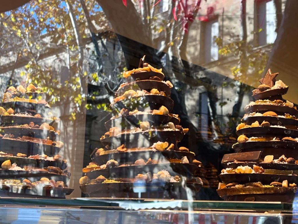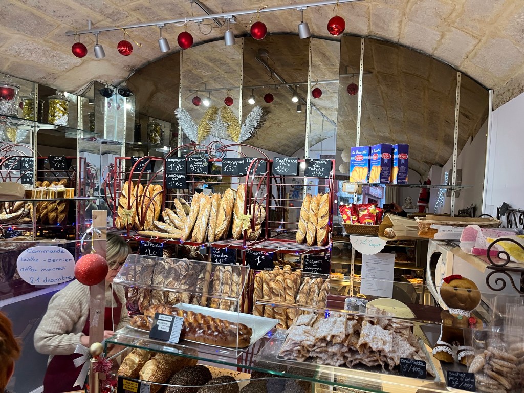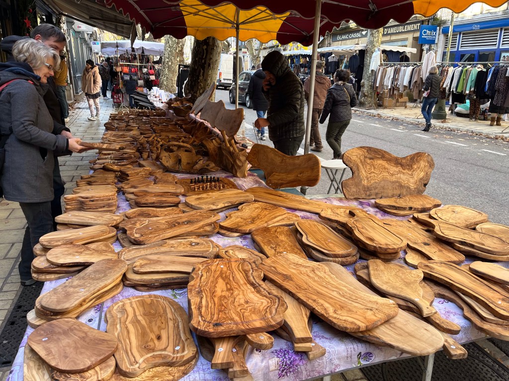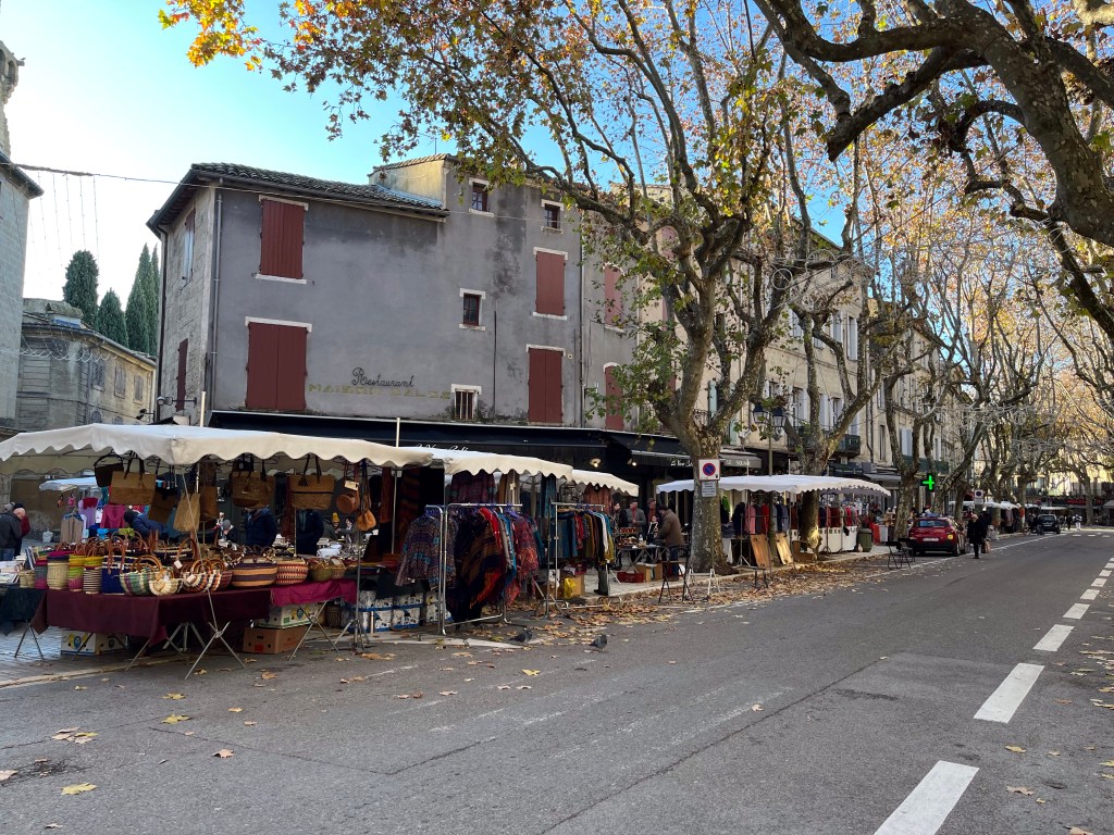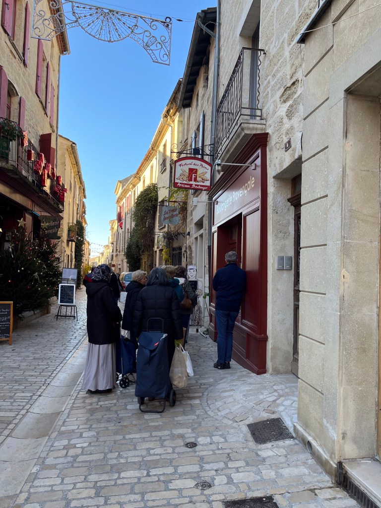 Greetings from beautiful and cold Uzes, France Uzes is famous for its Saturday market. It’s open year round and everything in the world is sold on the streets, squares and alleys of beautiful Uzes. Let’s take a walk through the city.The vendors setup every Saturday in a matter of an hour or so, and then take it all down every Saturday afternoon. Amazing!Fresh, beautiful produce in December! You know we’re buying our weekly needs.This guy is frying Eggplants and selling them so you can make eggplant parmigiana 😎Fresh pasta?The amount of fresh food is stupendous. New Orleans style shrimp? Or, I guess they’d say “French style”.Fresh seafood section of the market! Now that’s a paella! 😜This bakery features sliced breads, very heavy large loafs you can buy a slice from. Look at the people, they love their breads.Roasted chicken. Note the potatoes in the bottom, roasting in the chicken fat.✔️The queue is always long at the chicken stand.My bros selling sausages on the corner.It’s cold, how about a little pick me up?👍Can’t be in France without snails, can we?🤔Around the city, tables selling anything you want. Need a new charcuterie board?These are small Christmas trees made from chocolate rounds and then decorated with nuts and goodies. Unbelievably beautiful.Ok, this is the queue for my favorite bread bakery in the word. From the minute they open, until they close, there’s a line out the door.Simple, basic shop, just wonderful, wonderful bread!And, here’s an example. Crispy, soft on the inside, just the perfect baguette.€1.10 per loaf, reasonably priced.The city’s square, filled with vendors on market day. We wandered for hours looking at people and stuff. During the busy times of the year, over 40,000 people visit the market on Saturday. It’s fantastic and very, very well known in the south of France.